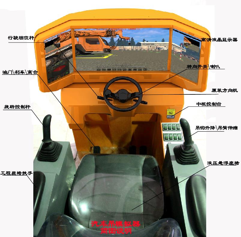 該模擬教學設備硬件由懸浮式座椅、駕駛座艙、底座平臺、PC系統,視景顯示器,方向機,檔位桿,操作手柄,IC卡讀寫裝置、360視角調整搖桿、油門、離合、剎車踏板,轉向開關,數據采集卡、控制臺及各種功能控制按鈕組件等組成。設備采用與真實汽車起重機相同的操作部件,逼真的操作手感,使得其操作功能、操作感覺與真機完全吻合;